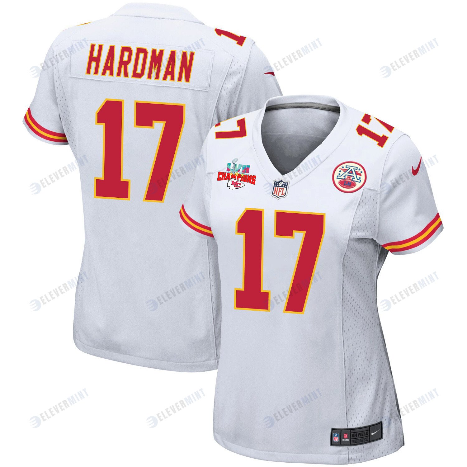Mecole Hardman 17 Kansas City Chiefs Super Bowl LVII Champions 3 Stars Women Game Jersey - White