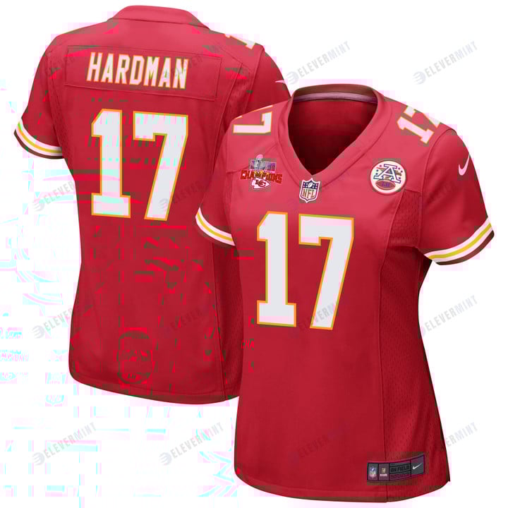 Mecole Hardman 17 Kansas City Chiefs Super Bowl LVII Champions 3 Stars Women Game Jersey - Red