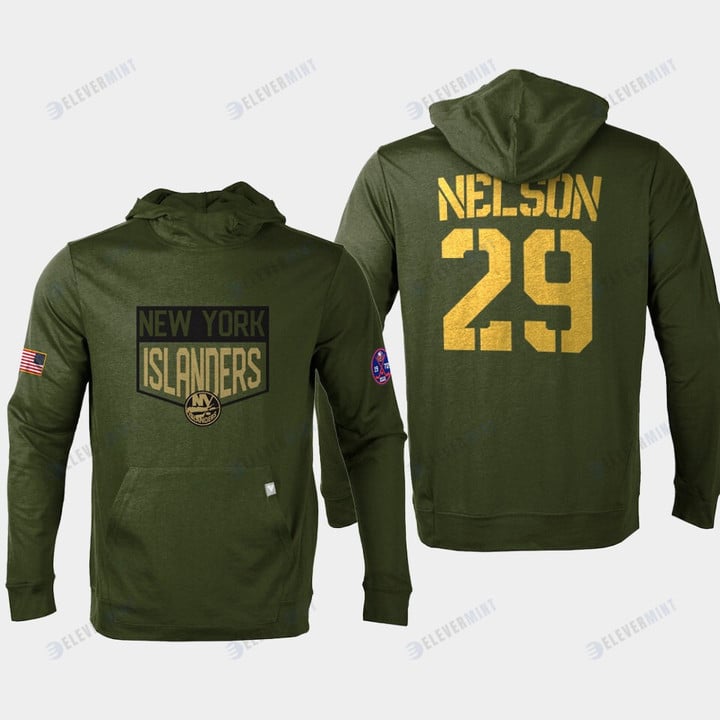 New York Islanders 29 Brock Nelson 2022 Salute to Service Olive Pullover Hoodie