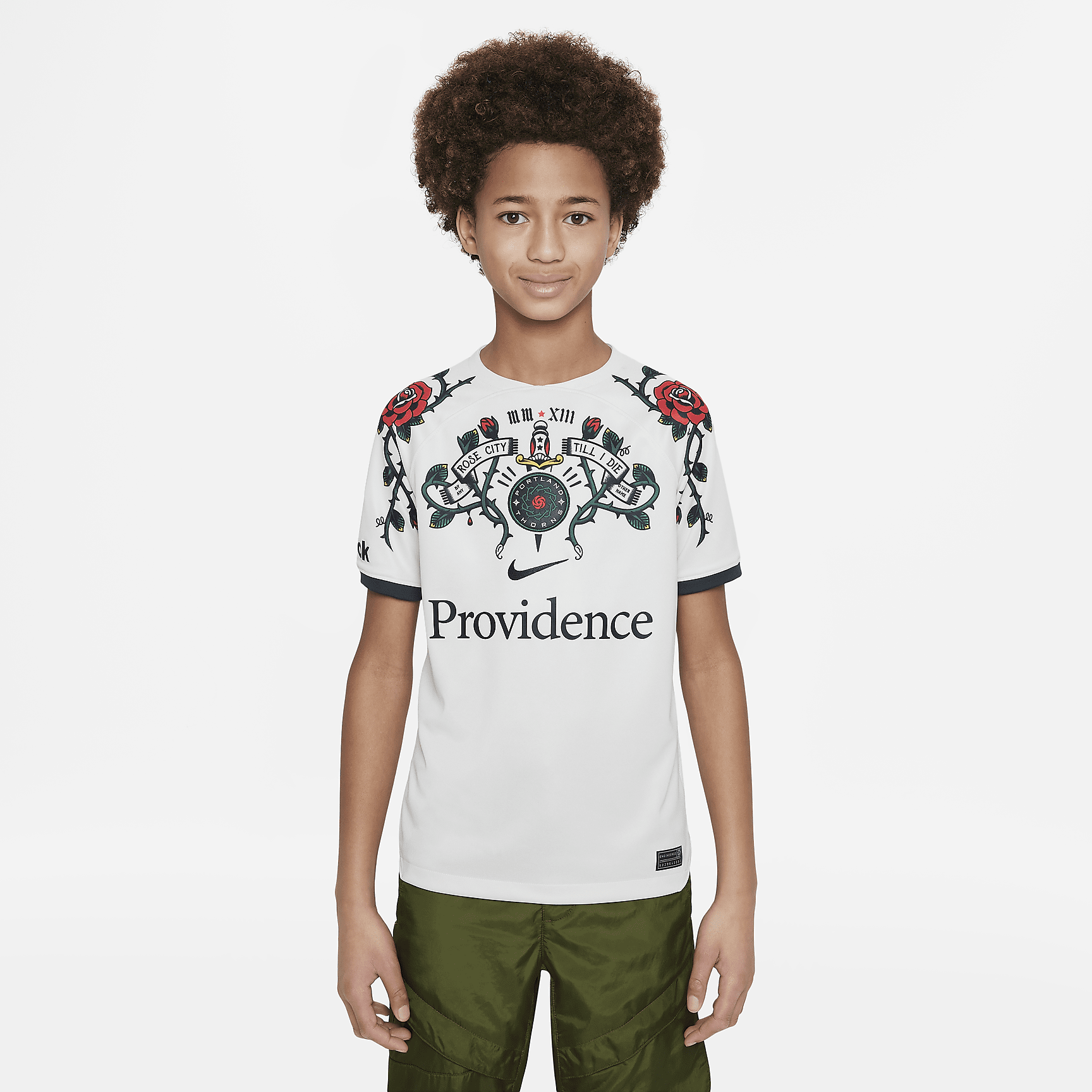 Portland Thorns FC 2023 Stadium Away Big Kids' Nike Dri-FIT Soccer Jersey - Light Bone/Pro Green/Black