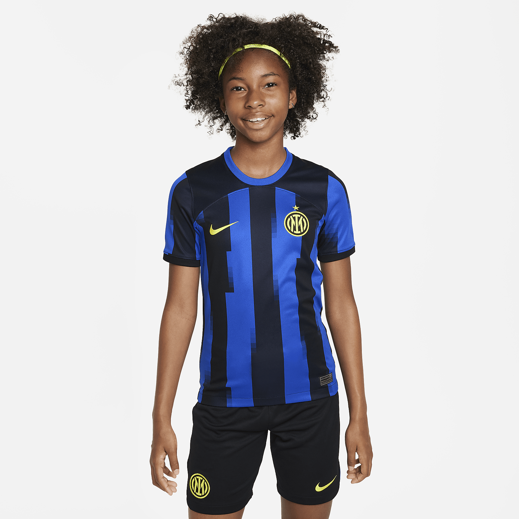 Inter Milan 2023/24 Stadium Home Big Kids' Nike Dri-FIT Soccer Jersey - Lyon Blue/Black/Vibrant Yellow
